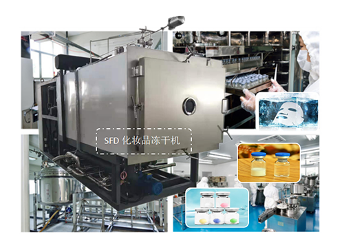 随着化妆品行业更新发展,人们对化妆品产品的消费要求具有营养、天然、安全、有效等特征。化妆品加工企业利用冻干技术,解决传统化妆品加工存在的问题,因为化妆品物料由于在SFD化妆品冻干机设备低温下进行干燥,物质中的热敏成分,例如蛋白质、微生物和其他生物活性成分能得到保护。同时化妆品冷冻干燥机在低温下运行,物质干燥过程中的一些易挥发性成分损失较少。由于化妆品物料冻干是在真空贫氧状态下进行的,物质中的一些易氧化的成分破坏减少。所以SFD化妆品冻干机广泛应用于各种化妆品原料和化妆品产品等冻干加工处理。包括化妆品冻干实验研发,冻干产品的生产加工。其中包括各种冻干粉、冻干面膜、冻干饼、冻干絮、冻干球等产品。同时广泛应用于在化妆品原料包括精细化工材料、营养液原料、肽原料、虾青素原料、SOD原料、保健原料等冻干加工处理。