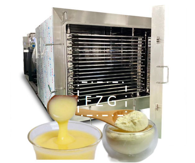 蜂王浆冻干技术是根据蜂王浆的共晶点和共熔点确定冻干工艺,在保证物料的颜色、体型和营养成分基本不变的要求下确定预冻温度和预冻时间,需要选用低温冻干机,预冻-50℃,保持3~5小时,在冻干机升华过程中确定一次干燥和解析干燥的温度和时间,运行真空度控制在10~30pa左右进行微调。具体的温度、时间和真空控制数据,可以通过FZG冻干机工程师指导培训掌握。通过掌握蜂王浆冻干技术应用于蜂王浆冻干机加工生产,得到含水1%左右的蜂王浆冻干粉,保存原有新鲜蜂王浆营养成分,是天然健康的保健食品。
