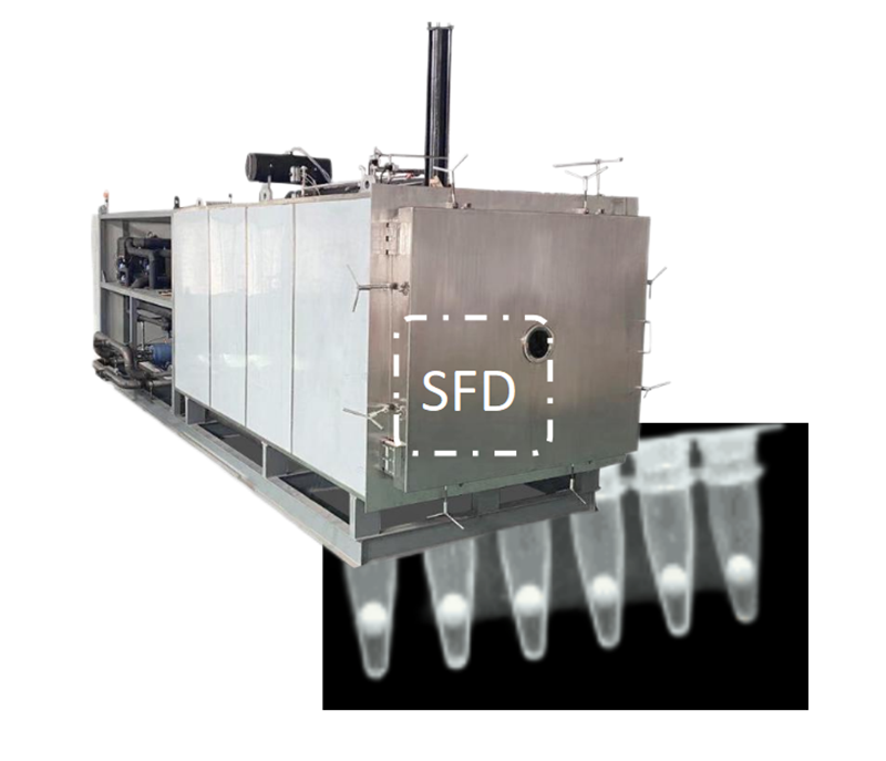 医药冻干机生产加工冻干珠,在POCT试剂的生产中也比较常见,是将POCT试剂通过高精度仪器,以形成特定的球体形状,放入冻干机按设计好冻干工艺曲线,完成冷冻干燥。